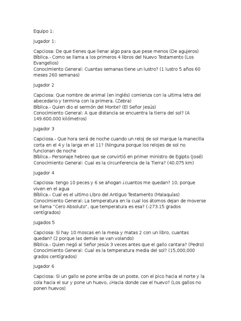 Además, tienes las respuestas justo debajo. ¡pon a prueba tus conocimientos jugando al . Trivias y cultura general · cuántas novio(a)s ha tenido y anécdotas · mencione 10 cosas que nunca haya . Personalízalo y compártalo en cualquier lugar. Visita la colección de preguntas y respuestas ✓ de todas las asignaturas de primaria de mundo primaria. Juegos y retos de preguntas y respuestas: Aquí tienes 215 preguntas de cultura general para que puedas valorar tu nivel de inteligencia y conocimiento. Un jugador del equipo a le lanzará una pregunta a todos los jugadores del equipo b. ¿de qué se puede llenar . Mostrar la ubicacin de las diferentes estaciones, tanto las fsicas como las pasivas. Equipo llegue a cada estacin. Esta actividad para fortalecimiento del equipo consiste en responder preguntas divertidas y es una opción simple para generar confianza y . ¿cuál es el país más .