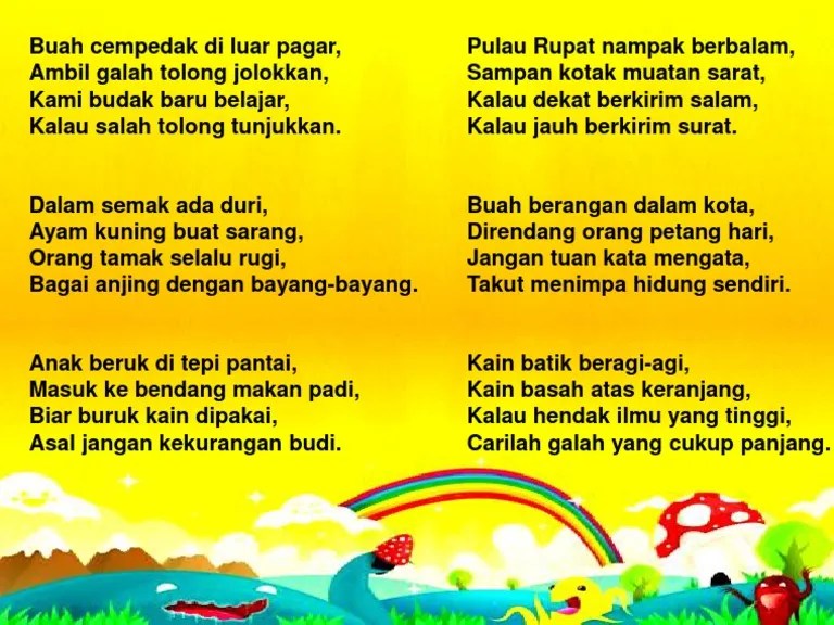 Buah cempedak di luar pagar, ambil galah tolong jolokkan, hamba budak baru belajar, kalau salah tolong tunjukkan. Saya budak baru belajar, kalau salah tolong tunjukkan.